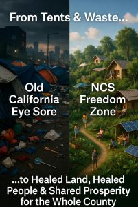 Instead of waiting for Sacramento to fix everything, NCS is building Freedom Zones inside each county. A Freedom Zone is county-owned land dedicated to real healing and prosperity. The county allocates a portion of its own land (we recommend 10%), redirects existing grants, and creates a safe, voluntary space where people can heal and build.